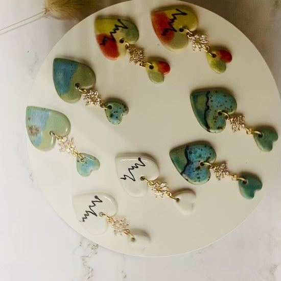 Fall in love with our enchanting Love Me Now Earrings. These exquisite hand-painted stoneware pieces are the epitome of rustic charm and radiate with exquisite glazes. With their heart-shaped design, they are the perfect symbol of love and affection. Whether you're treating yourself or surprising someone special, these earrings are the ultimate Valentine's Day gift. Measuring approximately 2 inches long, they are the ideal accessory to add a touch of romance to any outfit. Plus, with hypoallergenic posts, they are suitable for even the most sensitive ears. Don't wait! Show your love while our limited inventory lasts.